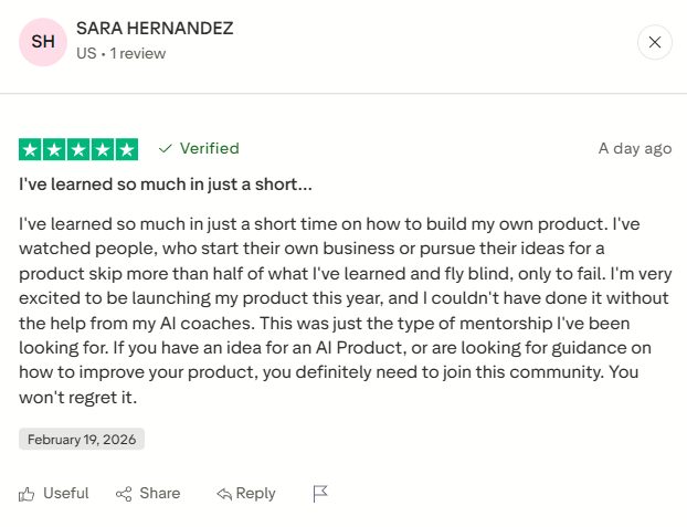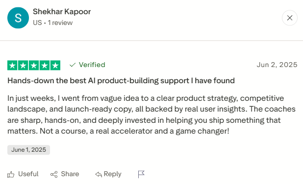 “In just weeks, I went from vague idea to a clear product strategy, competitive landscape, and launch-ready copy, all backed by real user insights. The coaches are sharp, hands-on, and deeply invested in helping you ship something that matters. Not a course, a real accelerator and a game changer!”